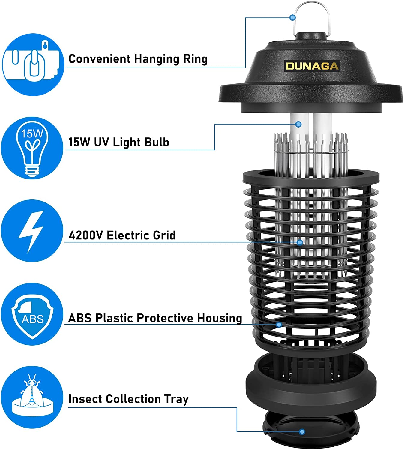 - Bug zapper come with 15W bulb emits blue purple light to attract bugs, once bugs flies in, it will be immediately killed by 4200v power grid, which can effectively eliminate mosquitoes, moths, bedbugs, flies, ect.